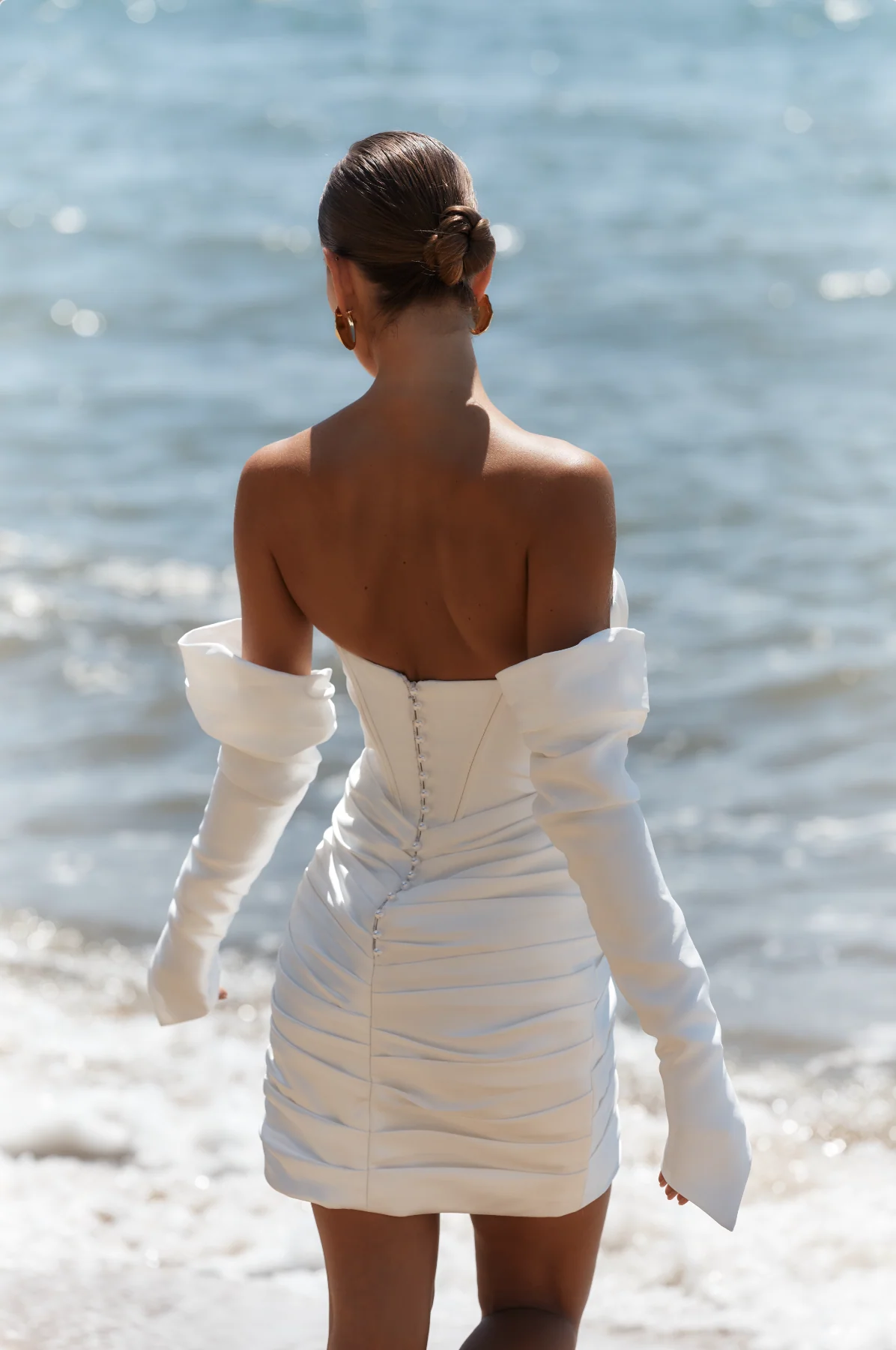 A strapless neckline with a subtle sweetheart curve creates an elegant feminine silhouette, while detachable long sleeves introduce a modern, directional edge.Ā