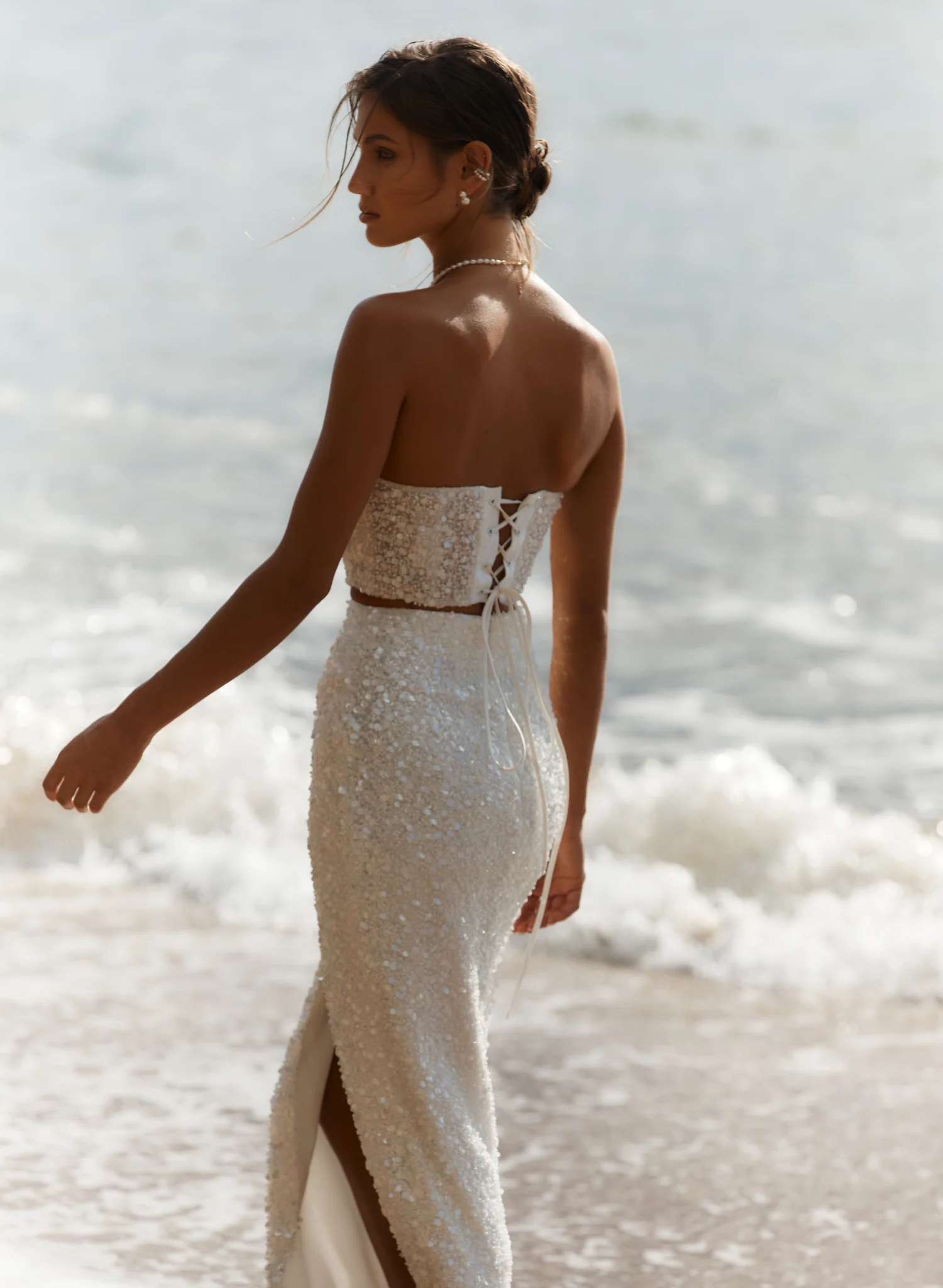 A modern statement from our Elope collection, the Elliot Bandeau is crafted in a sequin and pearl-embellished fabric designed to catch the light with every movement.