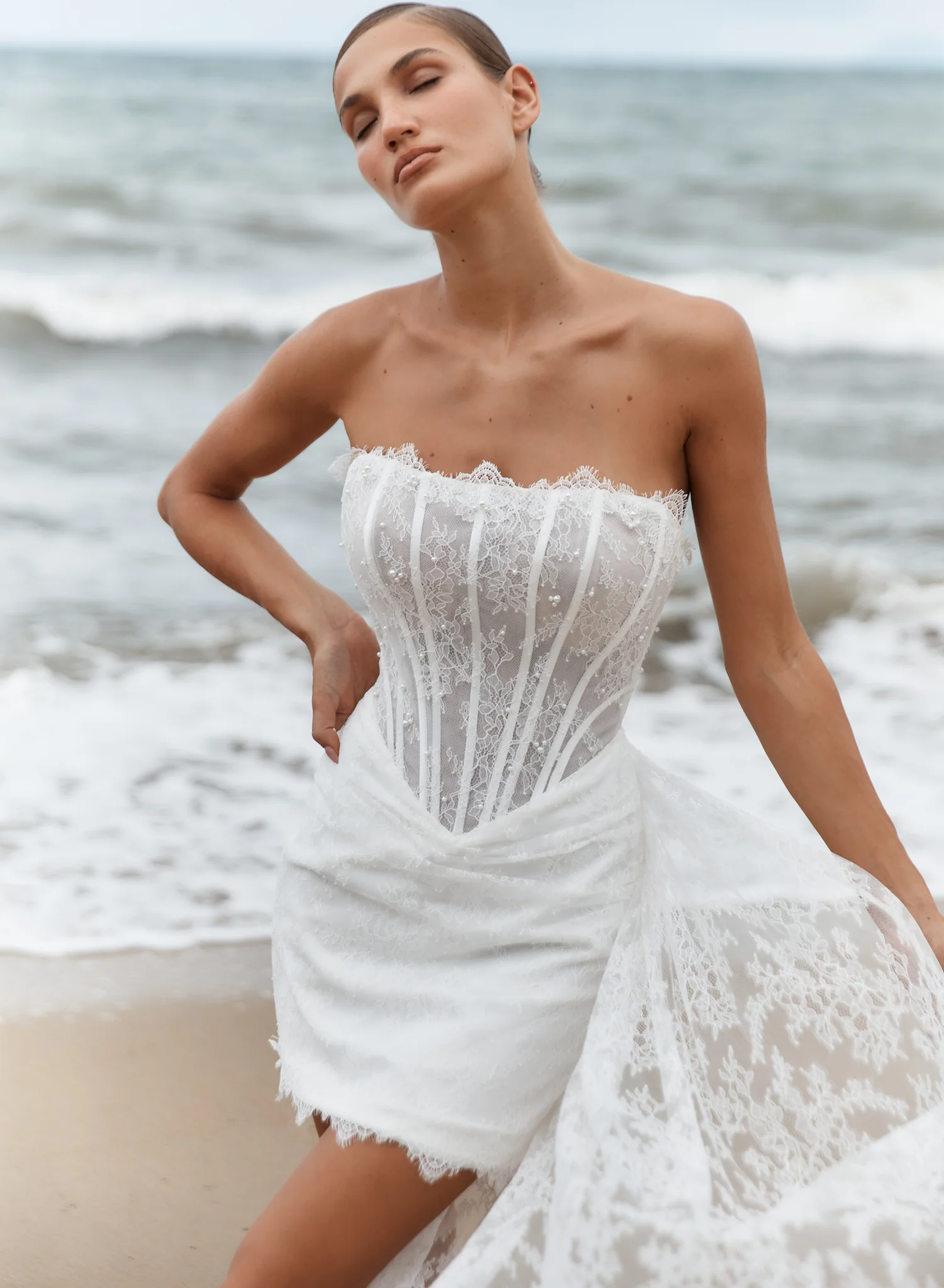 Sylvie is a romantic mini gown crafted from soft Chantilly lace, detailed with delicate boning and pearl embellishments throughout the bodice. The strapless neckline is trimmed with fine eyelash lace, while the lace-up back adds an element of structure and adjustability. Finished with a ruched lace mini skirt and optional matching overskirt, Sylvie is designed for the bride who wants to make a statement with elegance and edge.